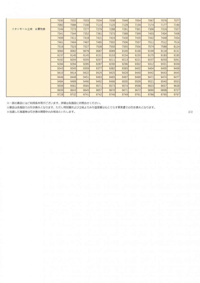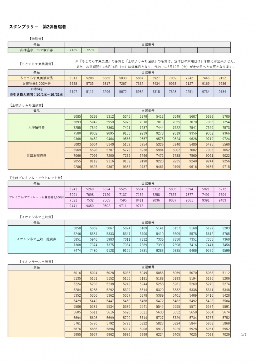 ※特別賞およびもとてらす東美濃賞、土岐よりみち温泉賞の景品交換は、「もとてらす東美濃」定休日の木曜日は引き換えが出来ません。