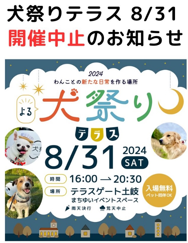 8月31日(土)に開催予定だった「犬祭りテラス」は、台風10号の接近に伴い、皆様の安全を最優先に考え中止とさせていただくことになりました